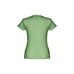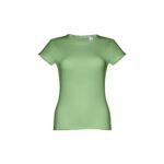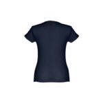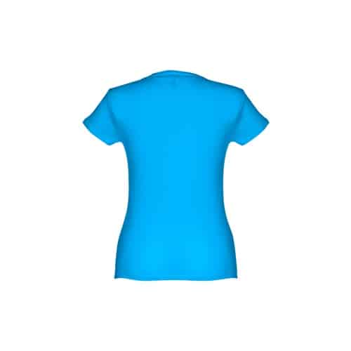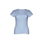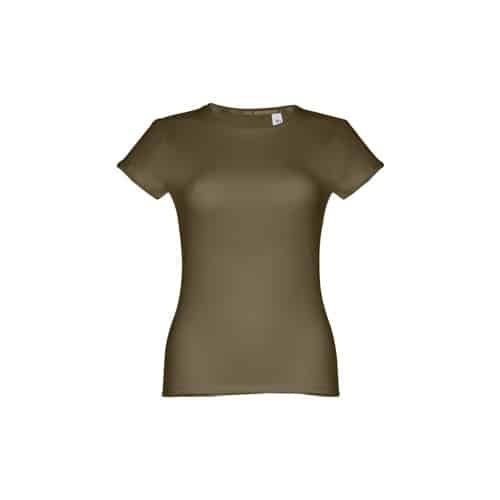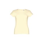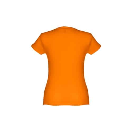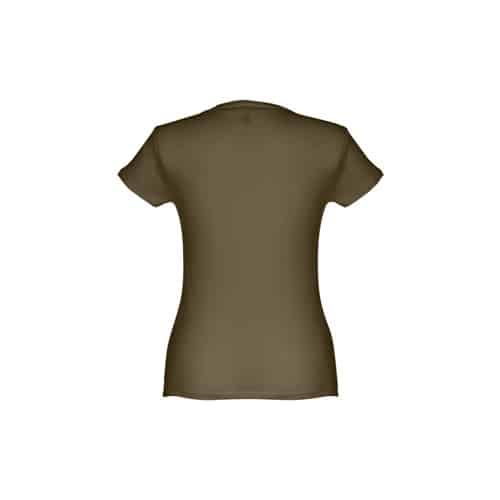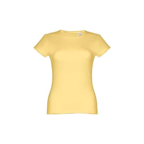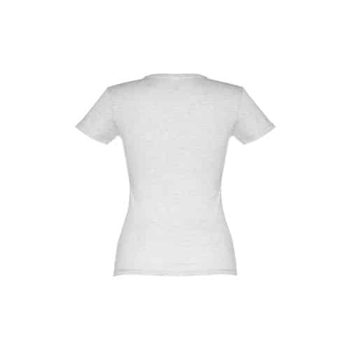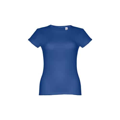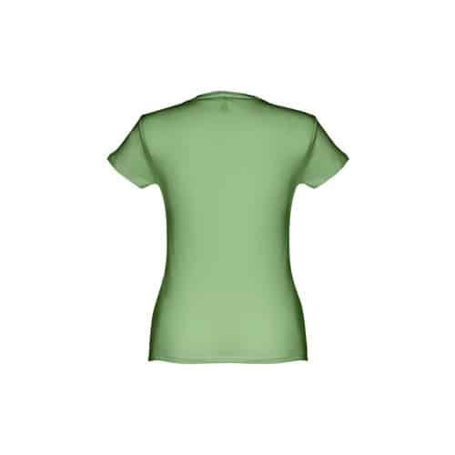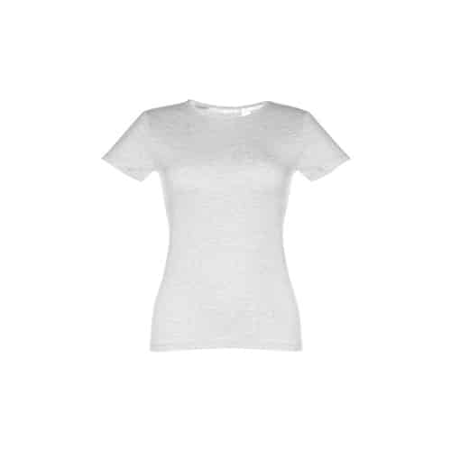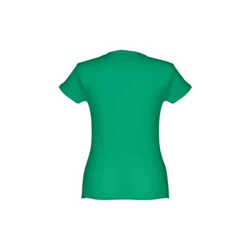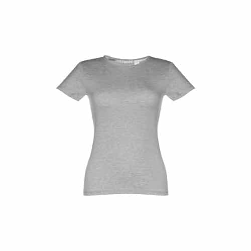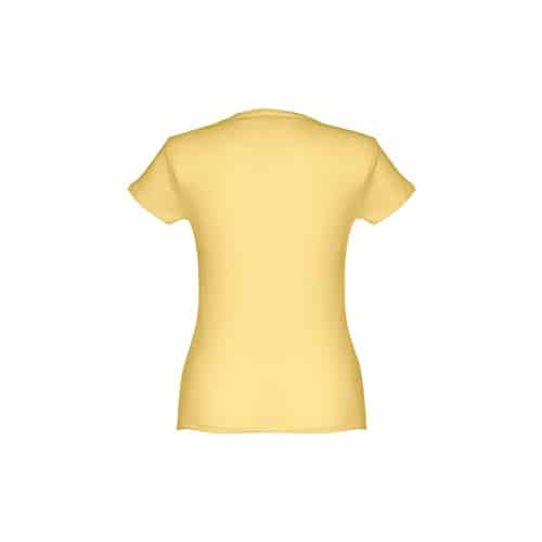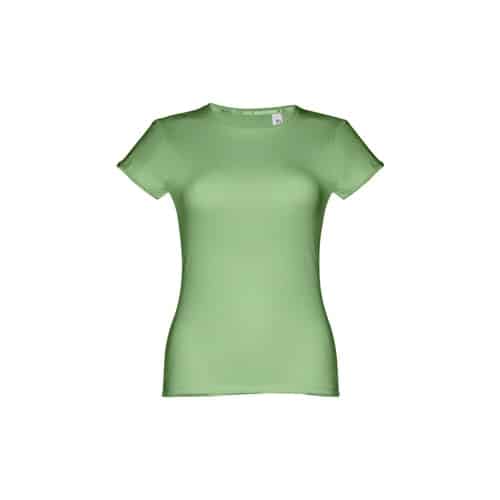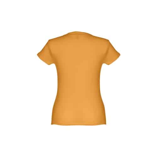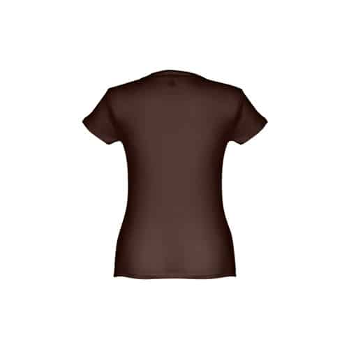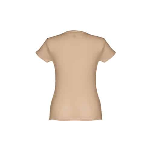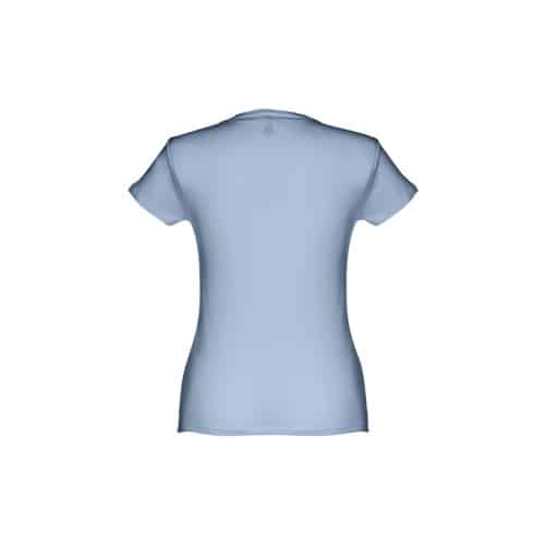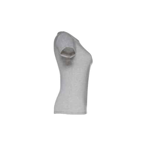 T-shirt ceinturé pour femme en maille jersey 100% coton (150 g/m²) avec fil de coton cardé (couleur 183 : 90% coton/10% viscose). Contient un col fin en jersey double avec un ruban de renfort en satin. Pièce coupée et cousue avec double couture sur les manches et le bas