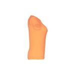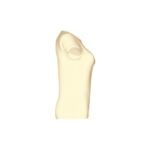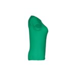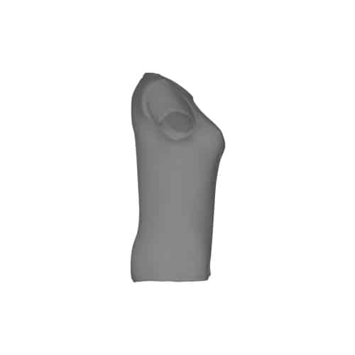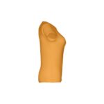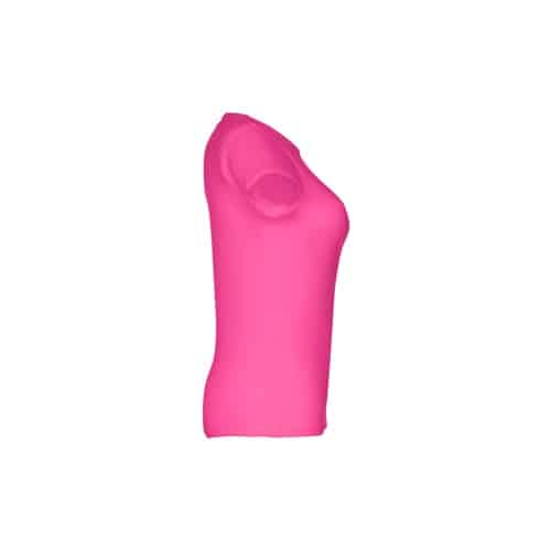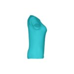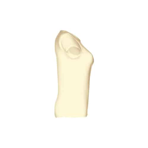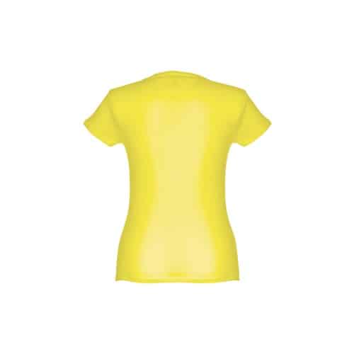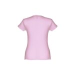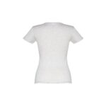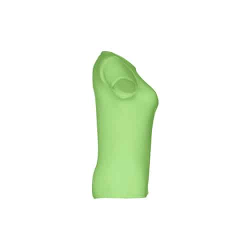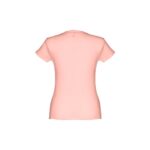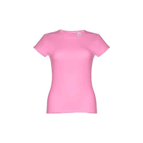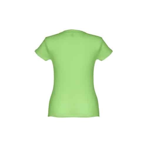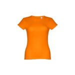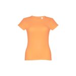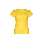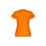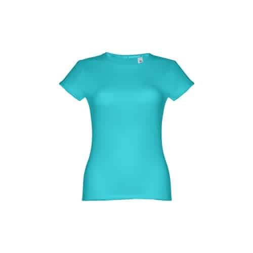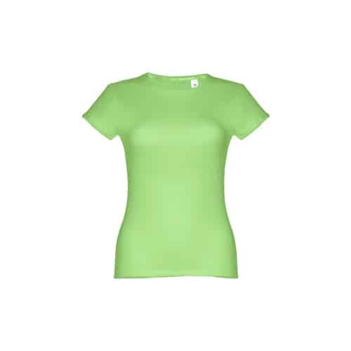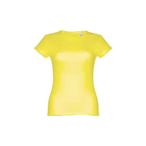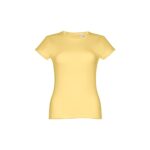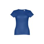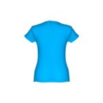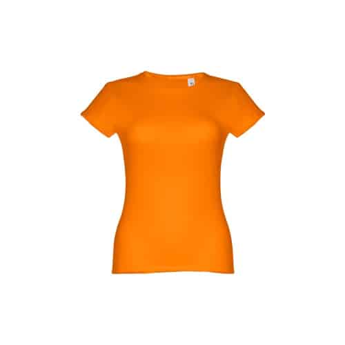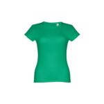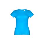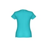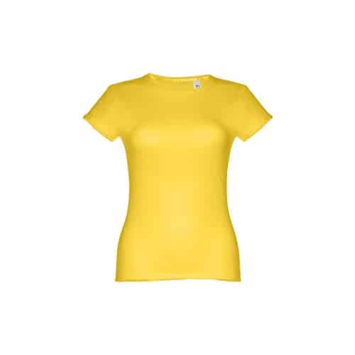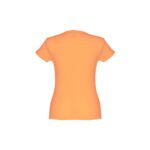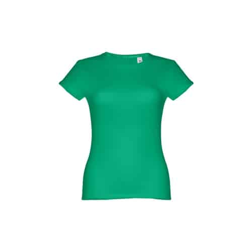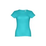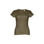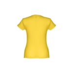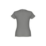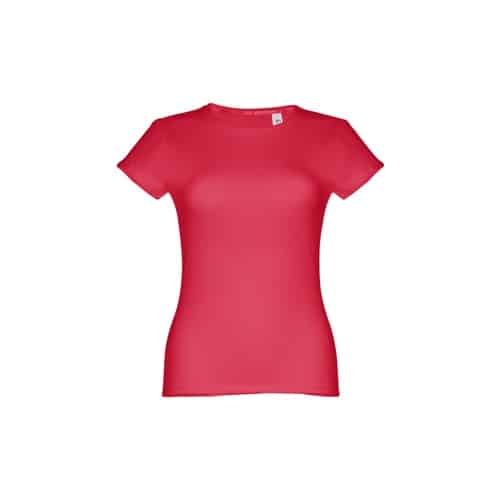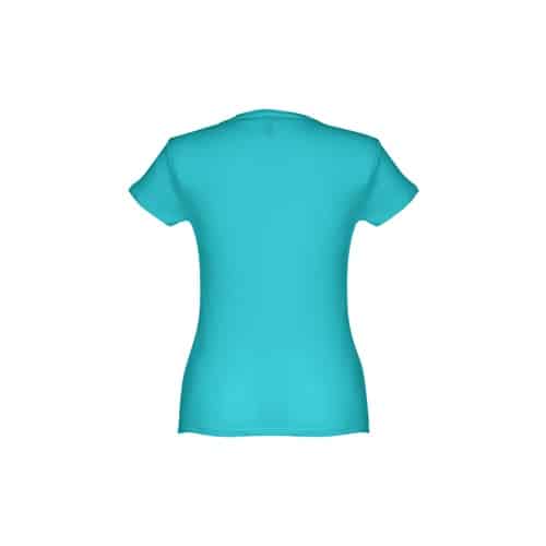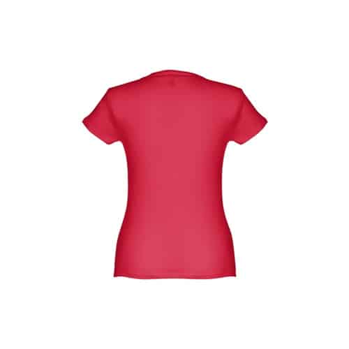 T-shirt ceinturé pour femme en maille jersey 100% coton (150 g/m²) avec fil de coton cardé (couleur 183 : 90% coton/10% viscose). Contient un col fin en jersey double avec un ruban de renfort en satin. Pièce coupée et cousue avec double couture sur les manches et le bas