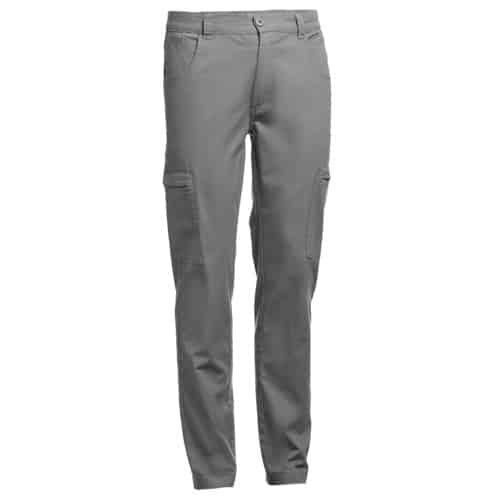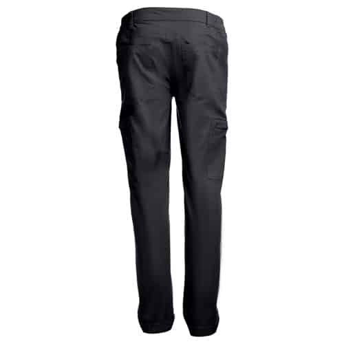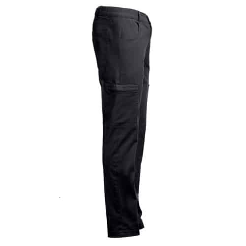 Pantalon en coton 98% et élasthanne 2% (240 g/m²). Contient 6 poches : 2 poches latérales avec fermeture, 2 poches avant et 2 poches arrière. Taille avec élastique sur les côtés
