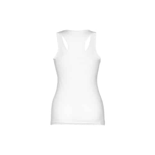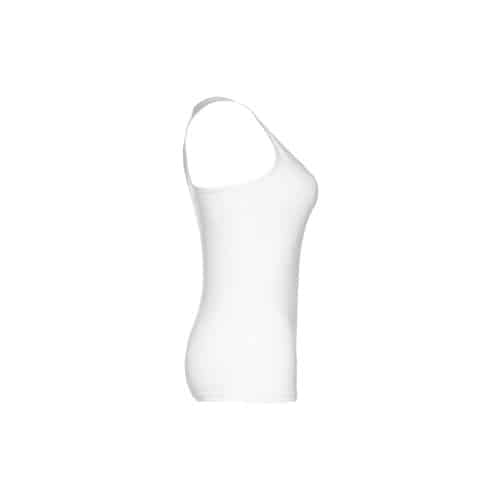 T-shirt sans manches pour femme en maille jersey 100% coton (160 g/m²) avec fil de coton cardé. Avec dos en » T » et col rond. Pièce coupée et cousue avec double surpiqûre en bas et finitions bords aux emmanchures et au col