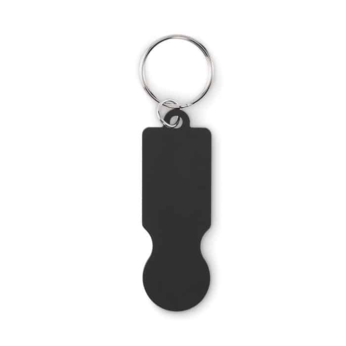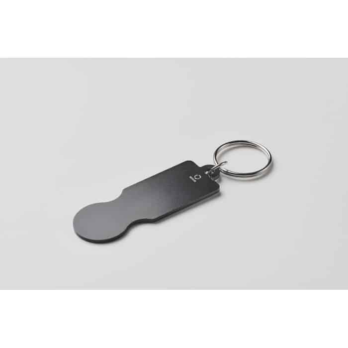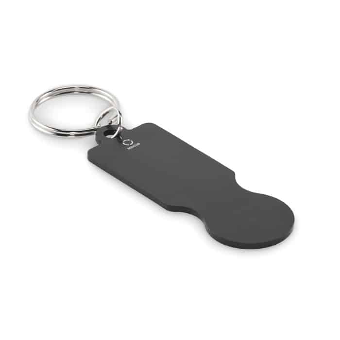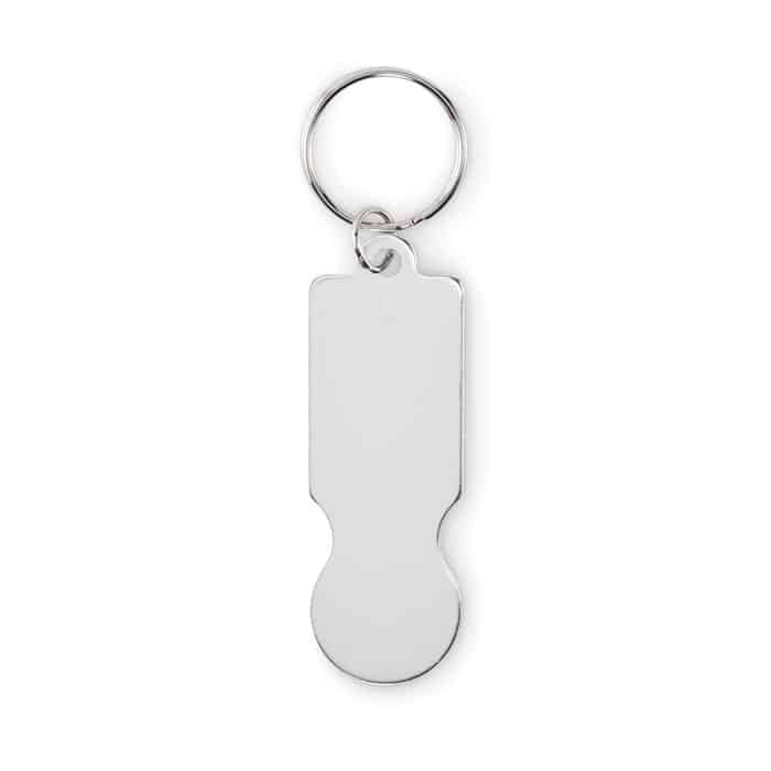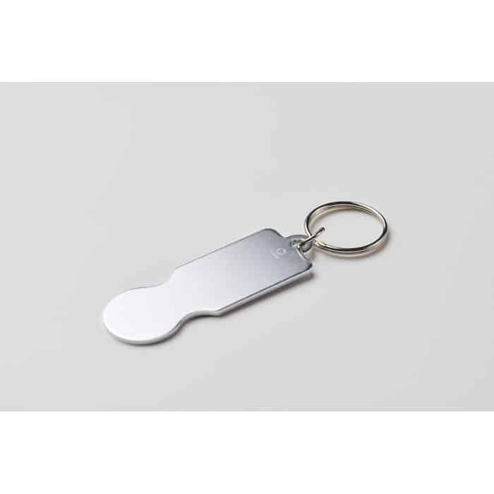 Jeton trolley accompagné d’un porte-clés, facilitant son utilisation et son transport.