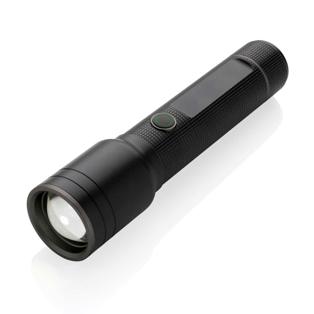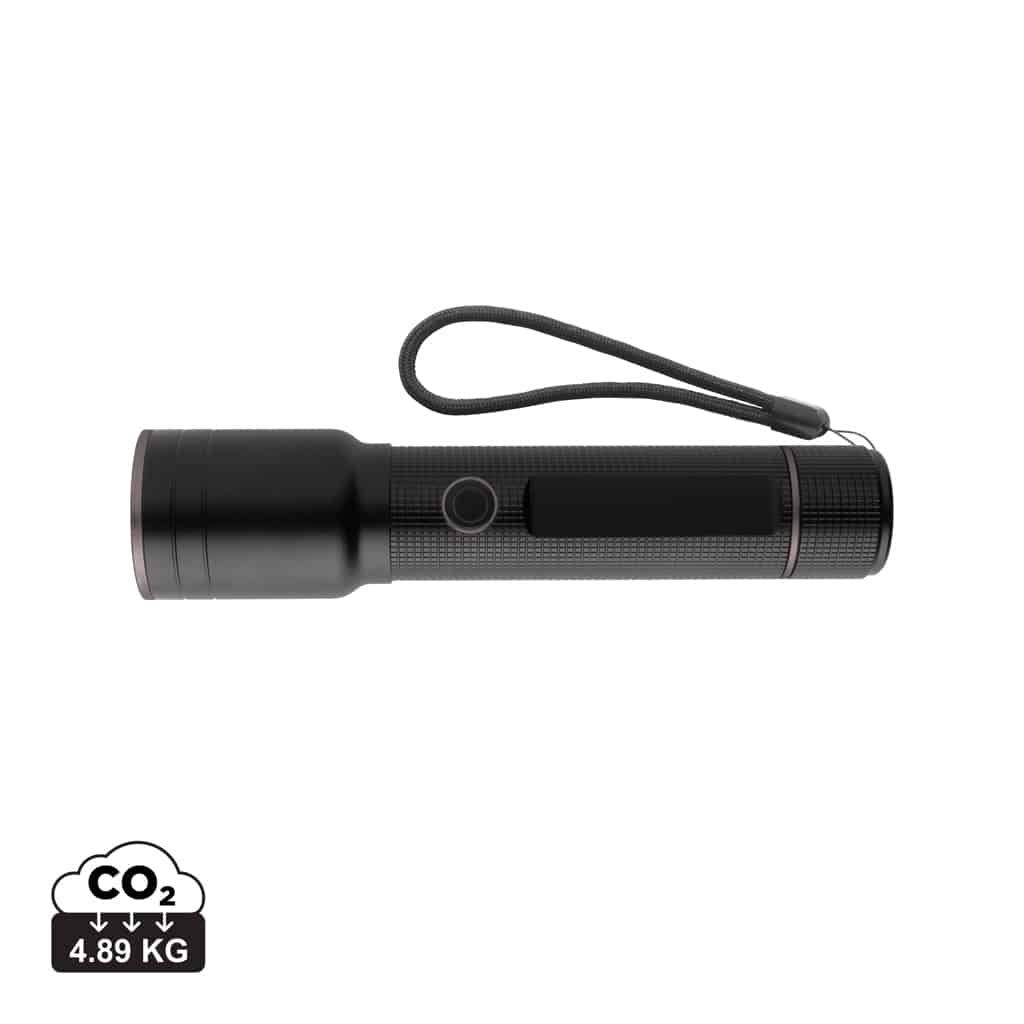 Découvrez la torche robuste rechargeable par USB en aluminium recyclé RCS, un éclairage puissant et durable pour vos besoins professionnels.