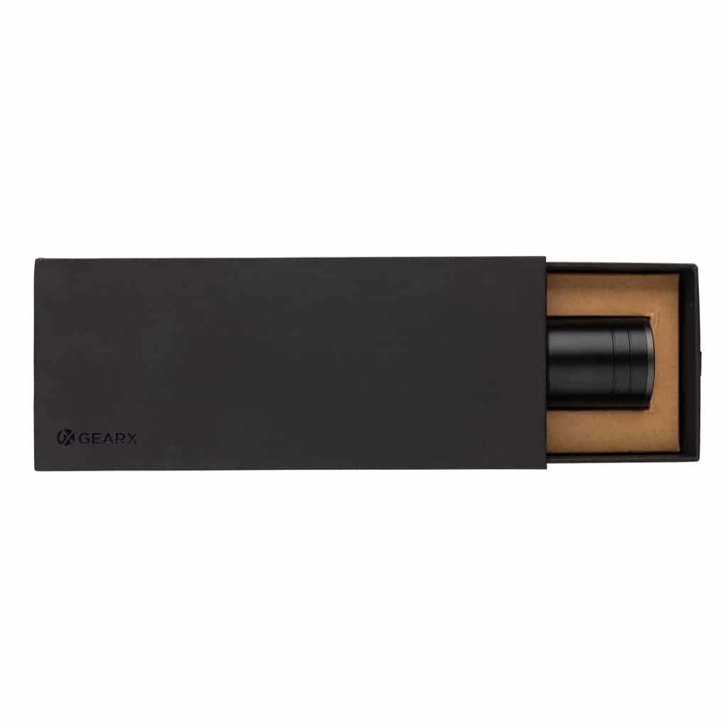 Cette torche rechargeable en aluminium recyclé certifié RCS allie robustesse et respect de l’environnement. Fabriquée avec 20 % de matériaux recyclés sur le poids total, sa conception durable valorise votre engagement écoresponsable. Son aluminium conserve ses qualités mécaniques tout au long du processus de recyclage et peut être recyclé à l’infini.