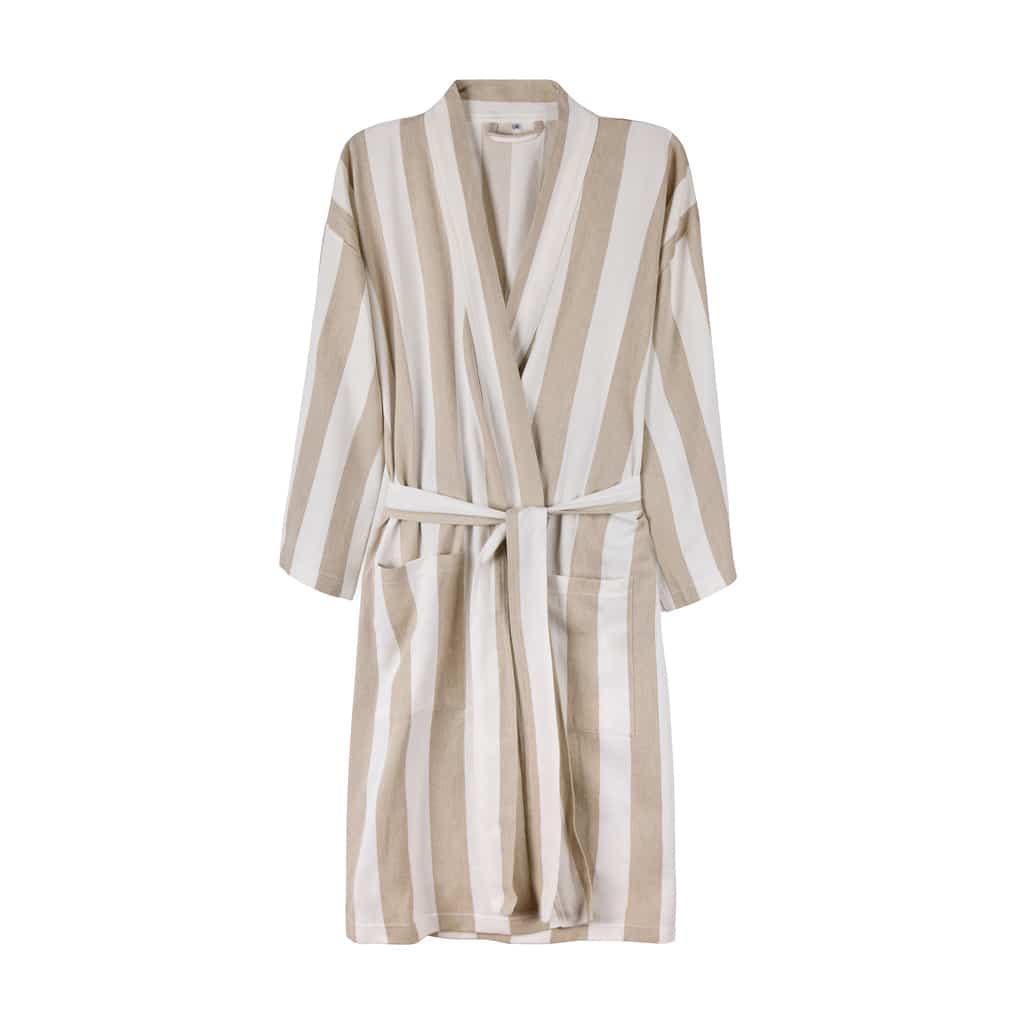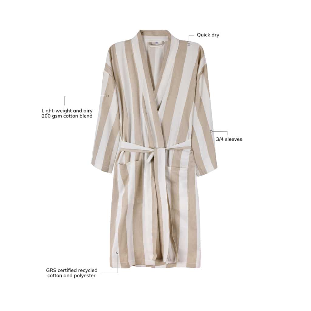 Le peignoir L/XL hammam GRS Ornos allie légèreté et douceur grâce à un tissu de 200 g/m² composé à 69 % de coton recyclé et 29 % de polyester recyclé, tous deux certifiés Global Recycled Standard (GRS). Sa matière innovante assure un séchage rapide tout en offrant une sensation de confort proche du coton naturel. Son design classique à rayures bicolores, avec col soigné, manches 3/4, poches pratiques et ceinture ajustable, répond aux attentes d’une clientèle exigeante.