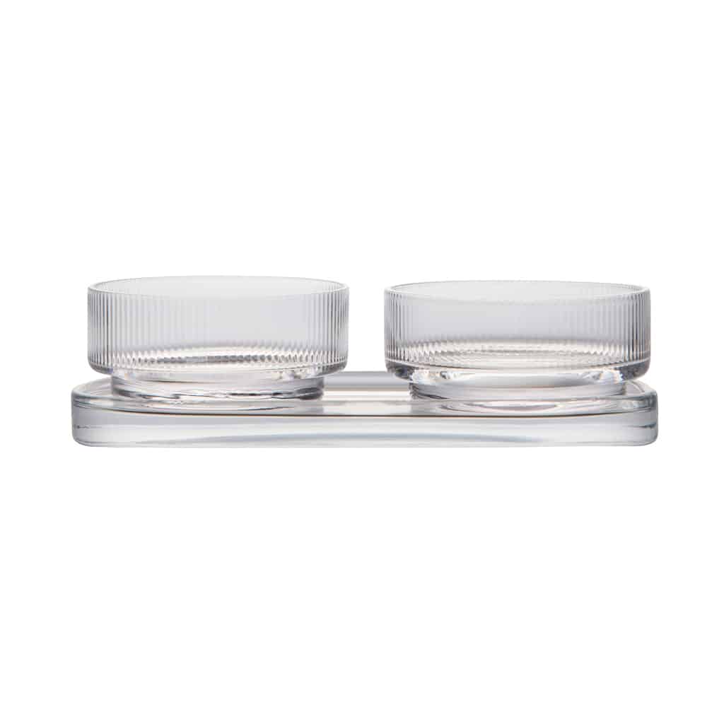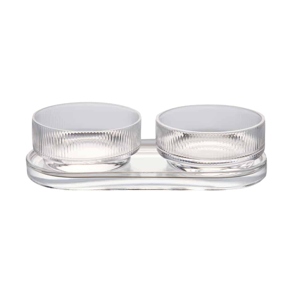 Deux bols d’une capacité de 250 ml chacun, accompagnés d’un plateau coordonné pouvant être utilisé séparément ou ensemble selon la présentation souhaitée.