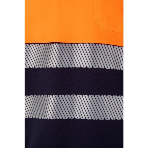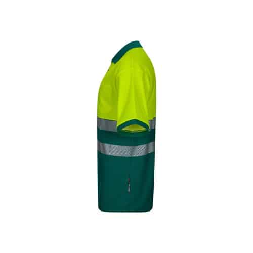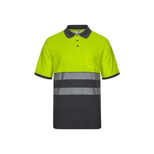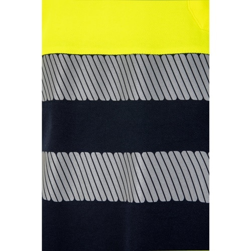 Polo en piqué bicolore (150g/m²) à manches courtes, en coton (55%) et polyester (45%). Boutons, col et bas côtelés de couleur contrastée. Bandes réfléchissantes segmentées sur le torse. Comprend une poche poitrine. Produit conforme au règlement (UE) 2016/425, certifié par EN20471 et classe Nº 1