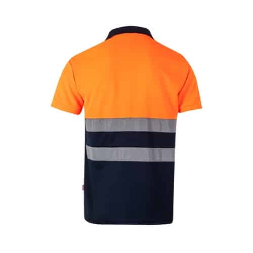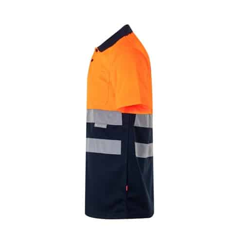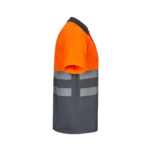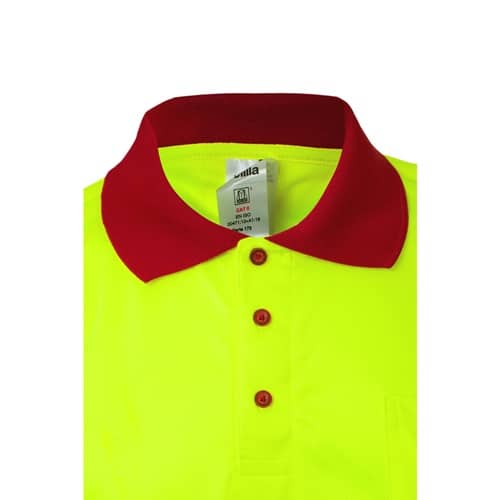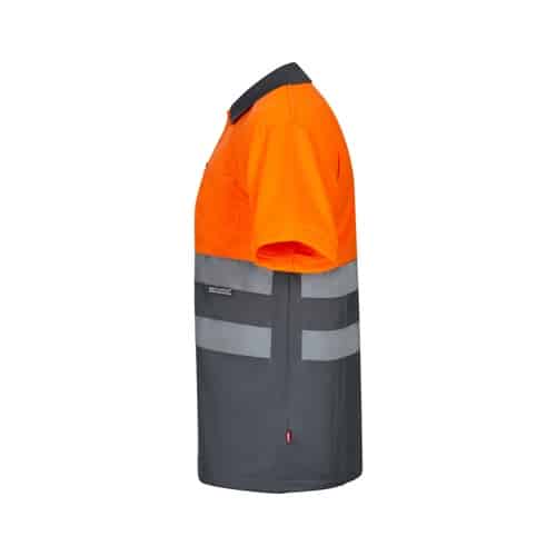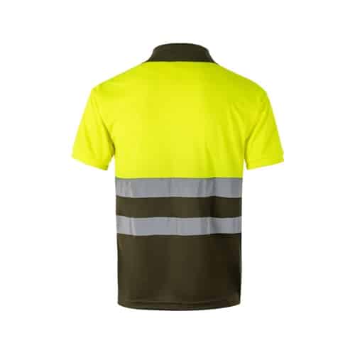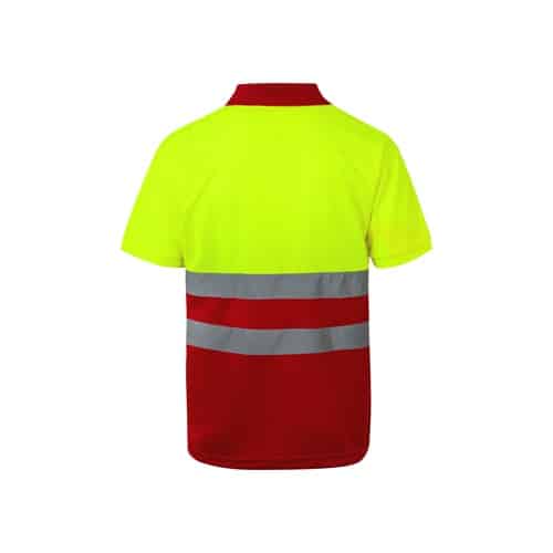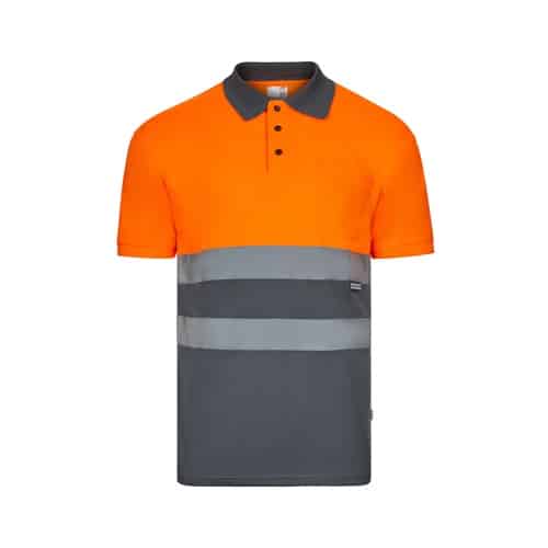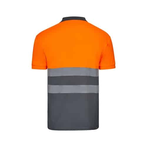 Polo bicolore (160g/m²) à manches courtes, en polyester (100%). Boutons et col de couleur contrastée. Col côtelé. Bandes réfléchissantes sur le torse. Poche poitrine. Produit conforme au règlement (UE) 2016/425, certifié par EN20471 et classe Nº 1