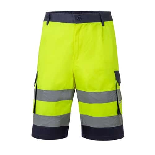 Bermuda multi-poches bicolore (210g/m²), en coton (20%) et polyester (80%). Avec ceinture élastique, soufflets, rabats, tirettes et bas de couleur contrastée. Bandes réfléchissantes. Contient six poches (2 poches françaises, 2 poches latérales à soufflet et 2 poches arrière). Produit conforme au règlement (UE) 2016/425, certifié par EN20471 et classe Nº 1