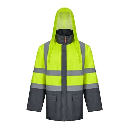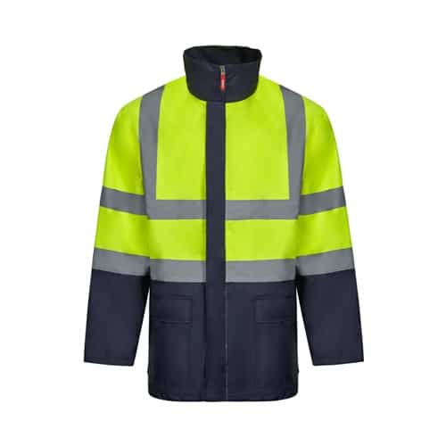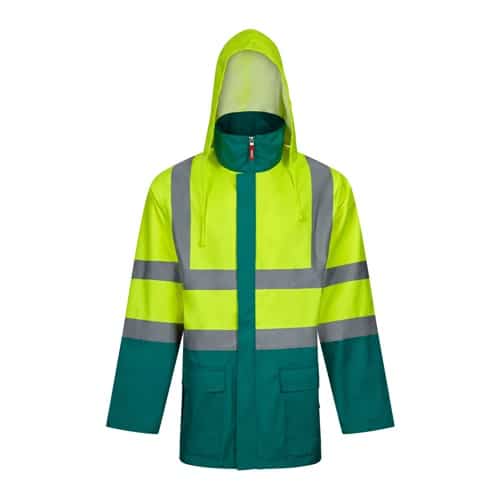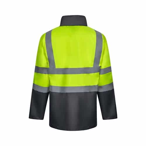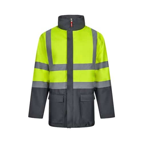 Parka 4 en 1 bicolore (180g/m²), en polyester (100%) avec finition PU. Quatre pièces en une : parka, imperméable, veste et gilet.Parka/ Imperméable : avec fermeture éclair centrale cachée avec patte de boutonnage qui se ferme par auto-agrippant, bandes réfléchissantes sur le torse, les épaules et les manches et capuche cachée , avec deux poches inférieures.Veste/gilet: avec fermeture éclair centrale, bandes réfléchissantes sur le torse et les épaules, poignets côtelés et manches amovibles. Trois poches (2 poches inférieures et 1 poche intérieure). Produit conforme au règlement (UE) 2016/425, certifié par EN20471 et classe Nº 2