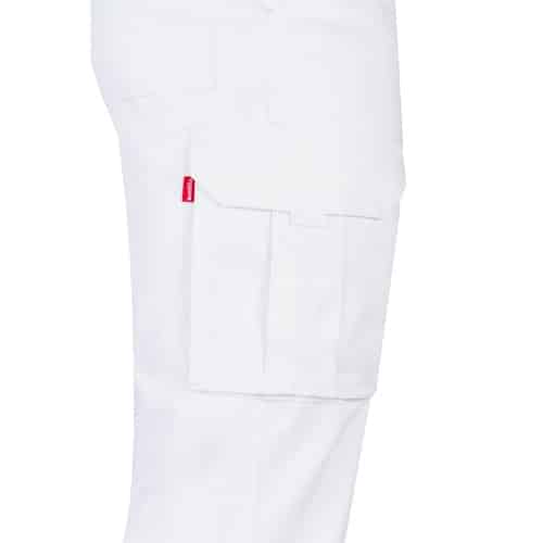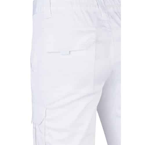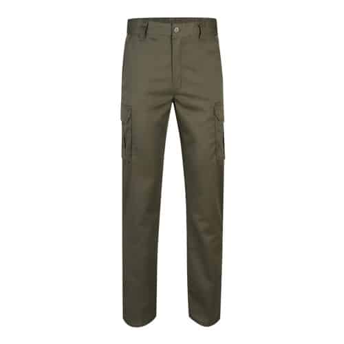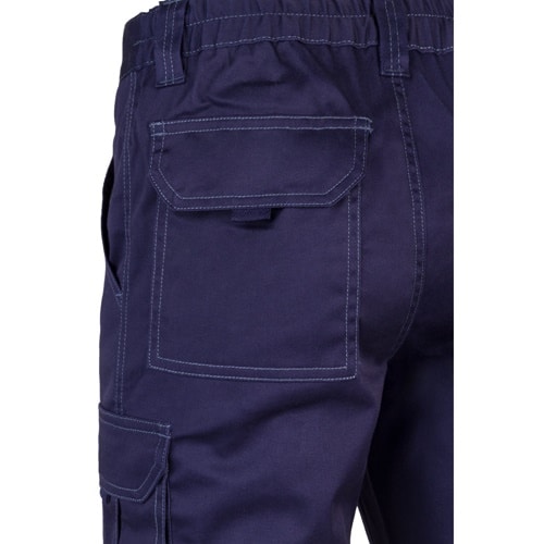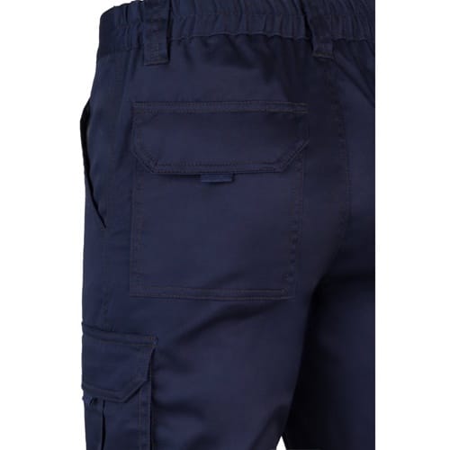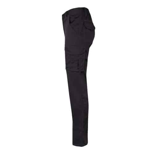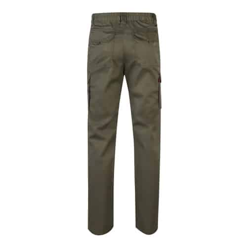 Pantalon stretch multipoches (240g/m²) en coton (46%), EME (38%) et polyester (16%). Coupe cintrée, taille élastiquée et six poches (2 poches françaises, 2 poches à soufflet latérales et 2 poches à soufflet arrière)