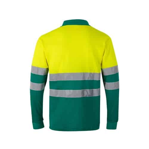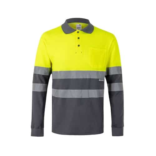 Polo en piqué bicolore (150g/m²) à manches longues, en coton (55%) et polyester (45%). Boutons et col de couleur contrastée. Col et poignets côtelés. Bandes réfléchissantes sur le torse et les manches. Avec 1 poche poitrine. Produit conforme au règlement (UE) 2016/425, certifié par EN20471 et classe Nº 1