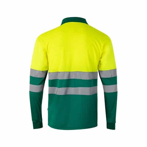 Polo bicolore (160g/m²) à manches longues, en polyester (100%). Boutons de couleur contrastée, col et poignets côtelés également de couleur contrastée. Bandes réfléchissantes sur le torse et les manches. Produit conforme au règlement (UE) 2016/425, certifié par EN20471 et classe Nº 1