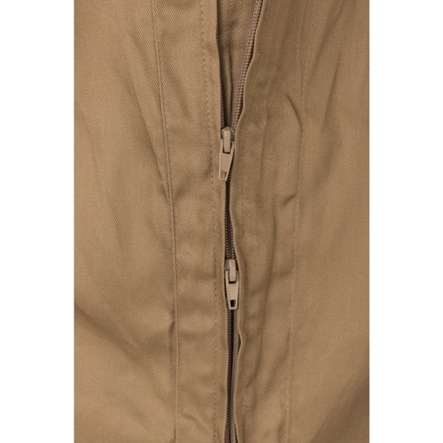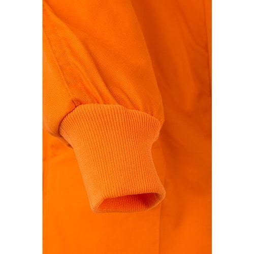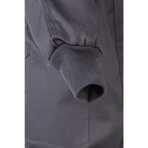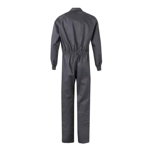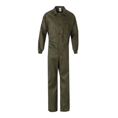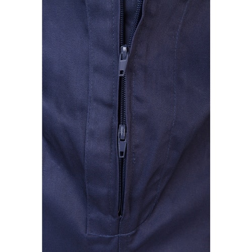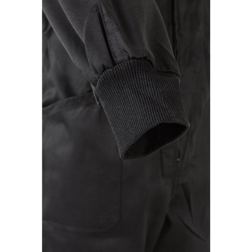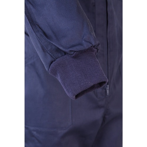 Combinaison en sergé (200g/m²), en coton (35%) et polyester (65%). Fermeture centrale asymétrique à double curseur. Taille élastiquée, poignets côtelés. Cinq poches (1 poche poitrine, 2 poches basses, 1 poche arrière et 1 poche sur la jambe droite)