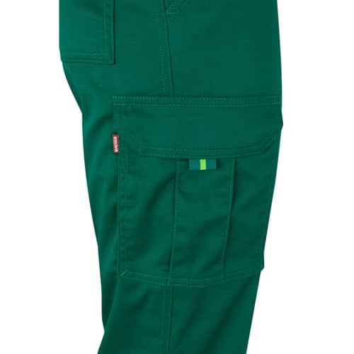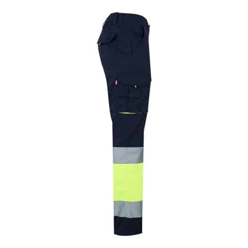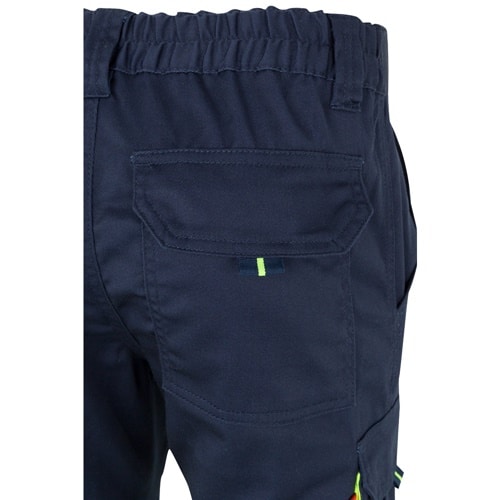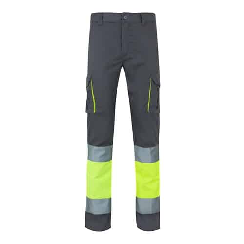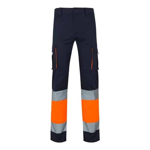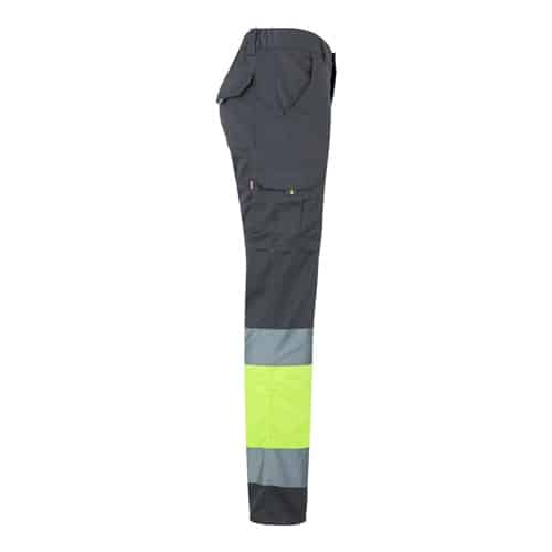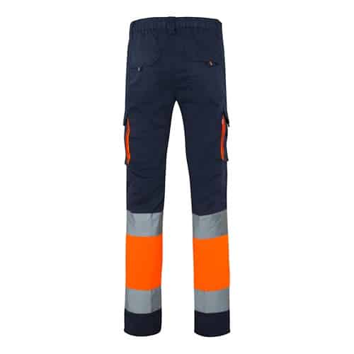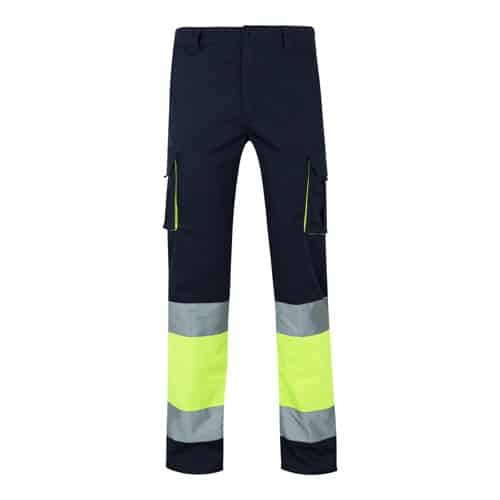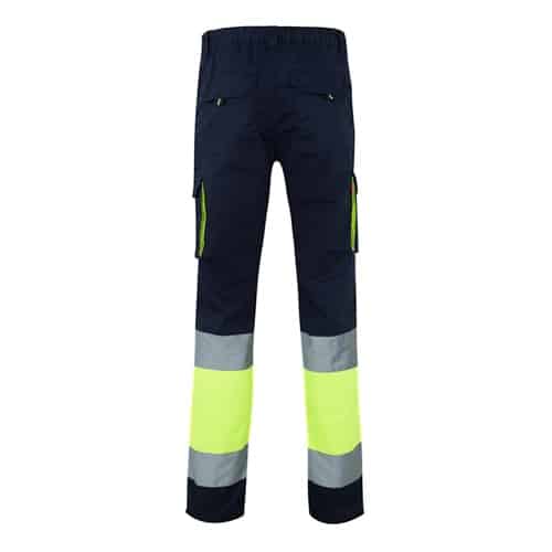Pantalon stretch bicolore multipoches (240g/m²), en coton (46%), EME (38%) et polyester (16%). Avec ceinture élastique et bandes réfléchissantes sur le bas du pantalon. Couleur contrastée sur les soufflets, les tirettes et le tissu entre les bandes réfléchissantes. Six poches (2 poches françaises, 2 poches latérales à soufflet et 2 poches arrière). Produit conforme au règlement (UE) 2016/425, certifié par EN20471 et classe Nº 1