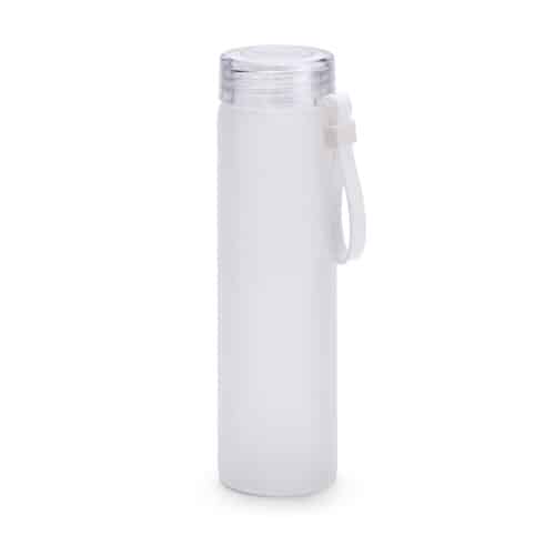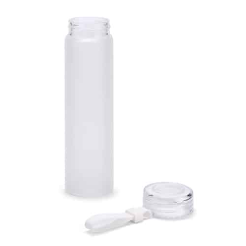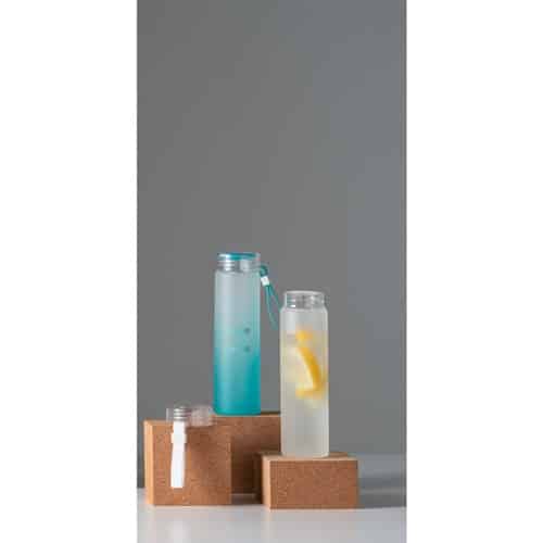 Gourde en verre borosilicaté avec bouchon à vis en AS. Avec une finition dégradée mate et une poignée en silicone sur le couvercle. Capacité jusqu’à 470 mL. Fourni dans une boite cadeau